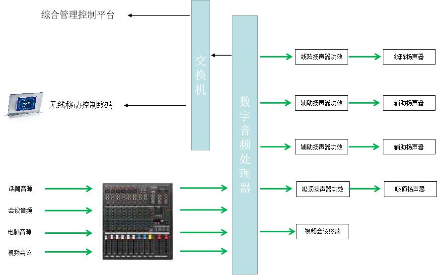 1、采用立體聲擴聲,實現左右完全覆蓋、聲像定位功能,再加上輔助補滿整個會場保證聲場均勻,滿足擴聲需求。